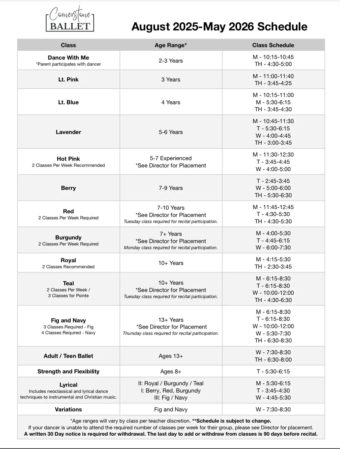 Need help determining class placement for your dancer? Email us at cornerstoneballetsc@gmail.com with your dancer’s name, age, and experience (if any) and we would be happy to help find the perfect fit for your dancer.